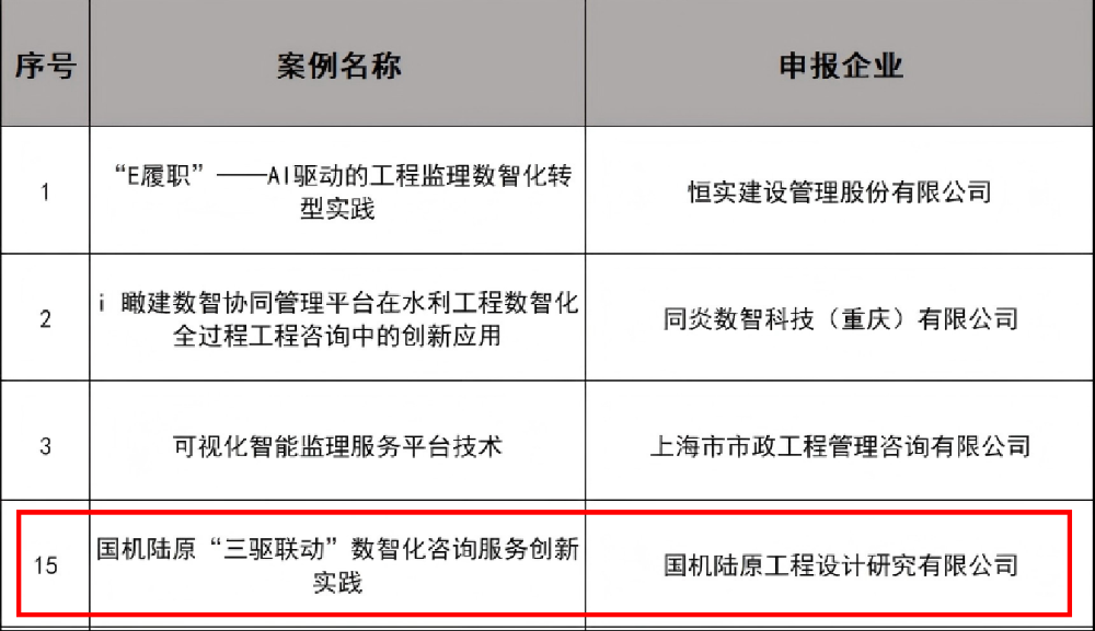 10月17日,公司申報(bào)的《國(guó)機(jī)陸原“三驅(qū)聯(lián)動(dòng)”數(shù)智化咨詢(xún)服務(wù)創(chuàng)新實(shí)踐》案例,在《建設(shè)監(jiān)理》雜志第二屆“工程監(jiān)理咨詢(xún)企業(yè)創(chuàng)新實(shí)踐卓越案例”征集中,從全國(guó)眾多優(yōu)秀實(shí)踐中脫穎而出,成為30份入選的優(yōu)秀案例之一,標(biāo)志著公司在工程咨詢(xún)數(shù)智化轉(zhuǎn)型領(lǐng)域的先行探索與領(lǐng)先實(shí)力獲得了行業(yè)高度認(rèn)可。