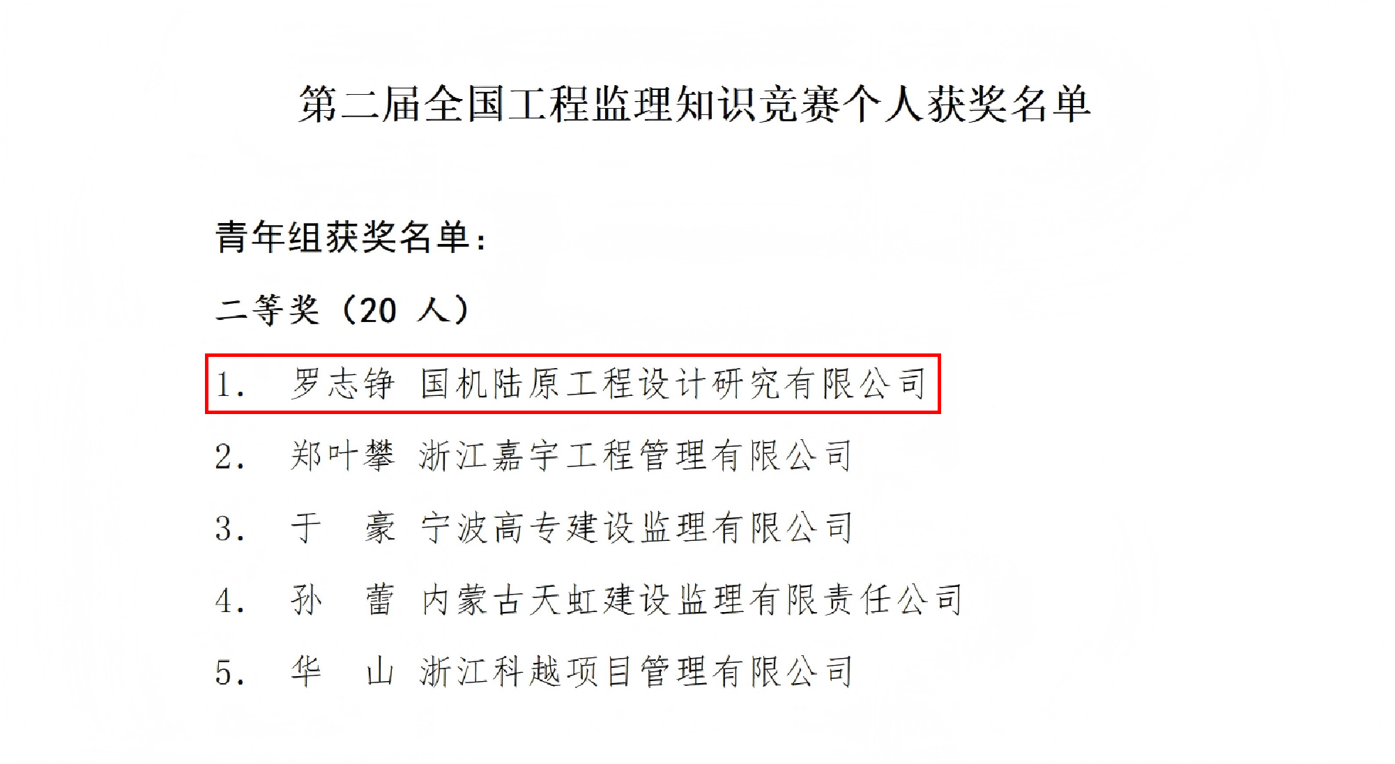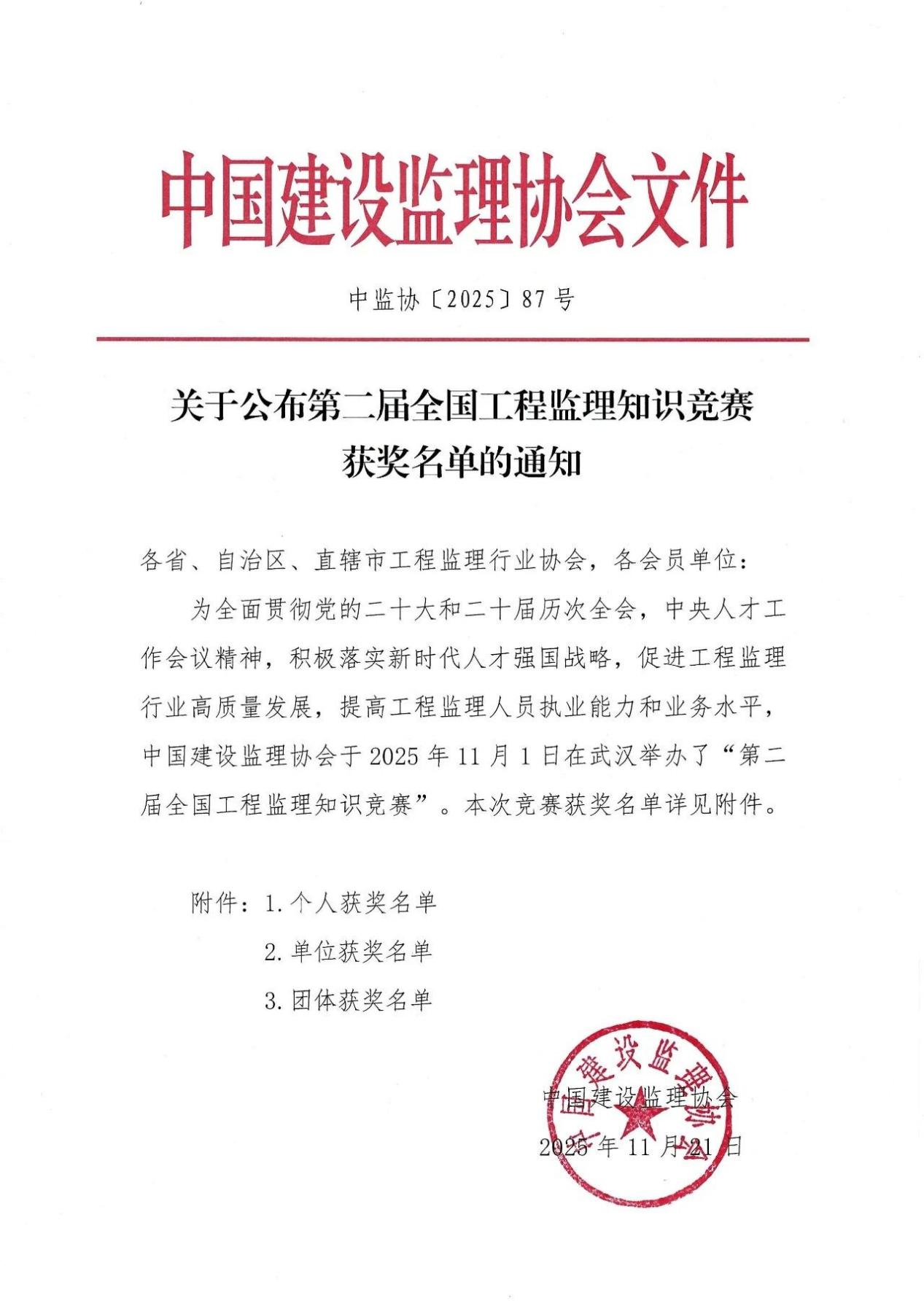 ????2025年11月1日,中國建設(shè)監(jiān)理協(xié)會在武漢舉辦“第二屆全國工程監(jiān)理知識競賽”。賽事結(jié)果于11月21日正式揭曉,公司參賽隊(duì)伍憑借扎實(shí)的專業(yè)功底與穩(wěn)定的現(xiàn)場發(fā)揮榮獲“優(yōu)勝單位獎”,羅志錚同志斬獲“青年員工組二等獎”,展現(xiàn)出公司在專業(yè)技術(shù)與人才建設(shè)方面的綜合實(shí)力。