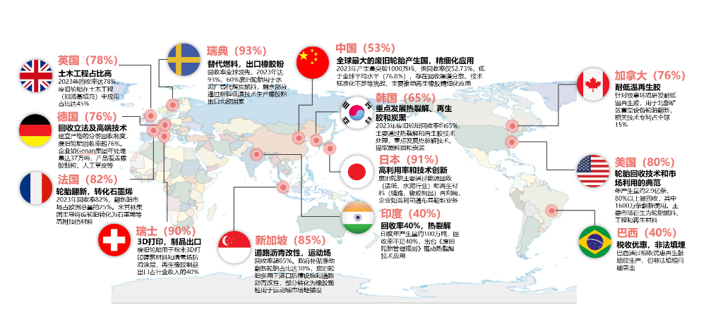 全球廢舊輪胎回收產(chǎn)業(yè)格局呈現(xiàn)顯著的地域差異與技術分層,發(fā)達國家憑借完善的政策支持、成熟的技術體系占據(jù)主導地位,通過立法強制回收及經(jīng)濟鼓勵措施從而使廢舊輪胎回收率超過70%。而發(fā)展中國家受限于管理機制滯后、技術落后及產(chǎn)業(yè)鏈分散,仍面臨資源浪費與環(huán)境污染雙重壓力,主要側重技術引進和產(chǎn)業(yè)鏈整合,多數(shù)發(fā)展中國家回收率仍低于50%。中國是全球最大的廢舊輪胎產(chǎn)生國,目前主要以再生橡膠精細化應用為主,存在回收渠道分散、技術標準化不足等挑戰(zhàn)。